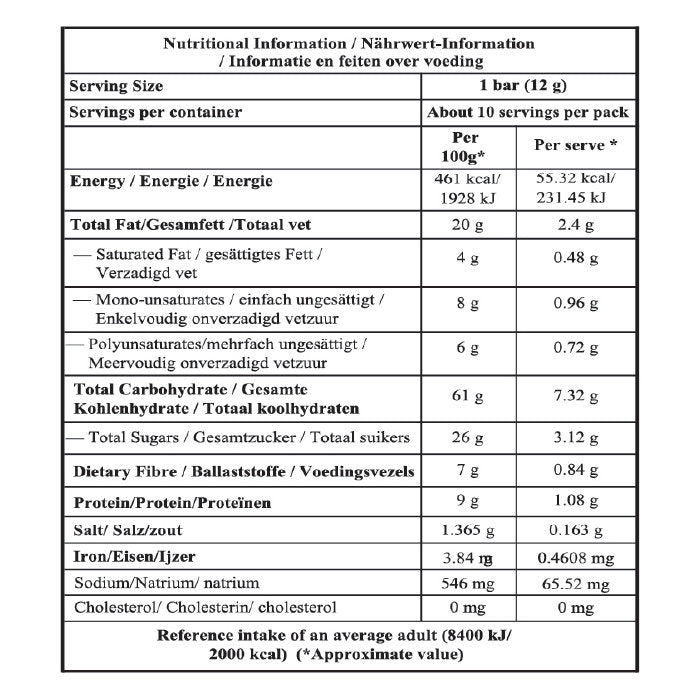 Contains Peanuts, Sesame seeds. May contain Wheat, Treenuts , Soy & Milk.