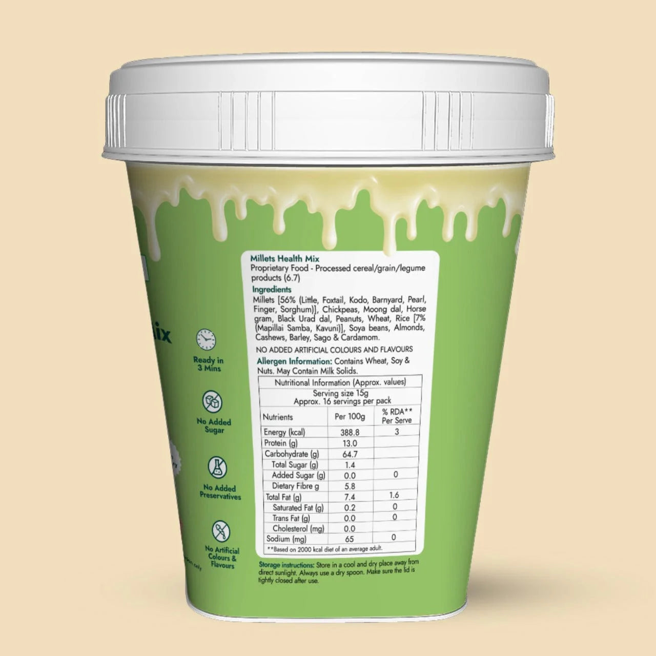 Millets (Little, Foxtail, Kodo, Barnyard, Pearl, Finger, Sorghum), Chickpeas, Moong dal, Horse gram, Black Urad dal, Peanuts, Wheat, Rice (Mapillai Samba, Kavuni), Soya beans, Almonds, Cashews, Barley, Sago, Cardamom. Contains 56% millet, rich in protein and dietary fiber.